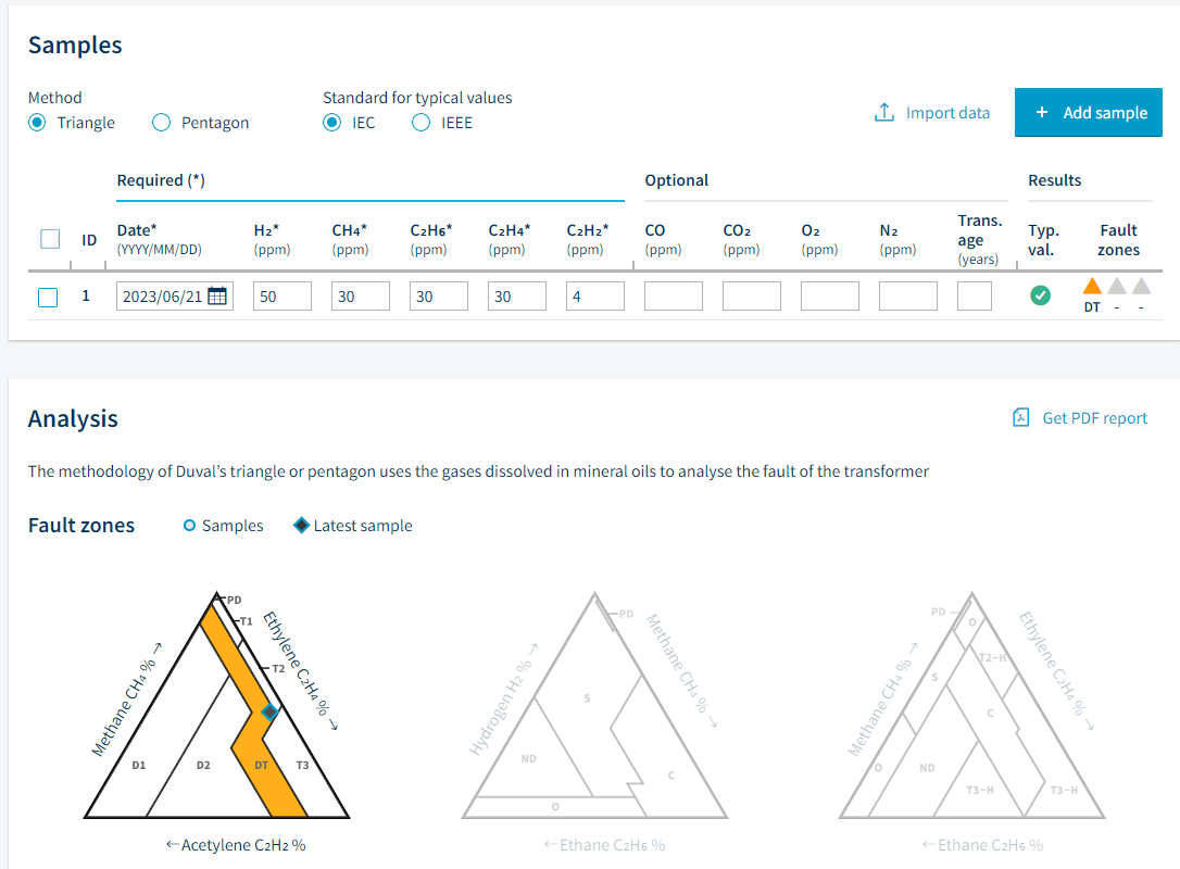 DGA 분석 후 측정된 가스 ppm 을 입력하면 Duval Triangle, Pentagon, IEC, IEEE 에 따라서 정상여부 및 결함종류를 아래와 같이 쉽게 확인하고 보고서로 작성할 수 있습니다. Vaisala OPT100 는 측정된 결과를 duval triangle, Pentagon 로 실시간 표시를 해주는 기능이 내장되어 있습니다. 2023.02.27 - [변압기 모니터링시스템, DGA, CT, PT, OT] - 멀티가스 유중가스분석기(DGA OPT100) 아래 사이트에 접속 후 사용해 보세요 https://www.vaisala.com/en/lp/dgacalculator?utm_campaign=VIM-GLO-EN-POW-RobustScience-Other-DGAcalculator&utm_med..